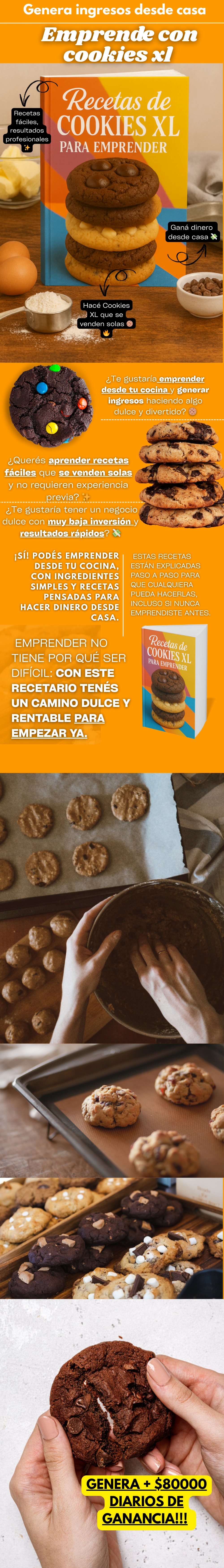 Incluye 10 recetas de Cookies XL súper rentables, tips, tiempos de cocción, variantes, y 2 páginas de estrategia para vender tus cookies desde casa.